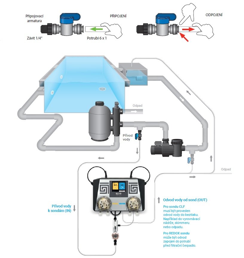 - Regulace obsahu volného chloru pomocí sondy Redox