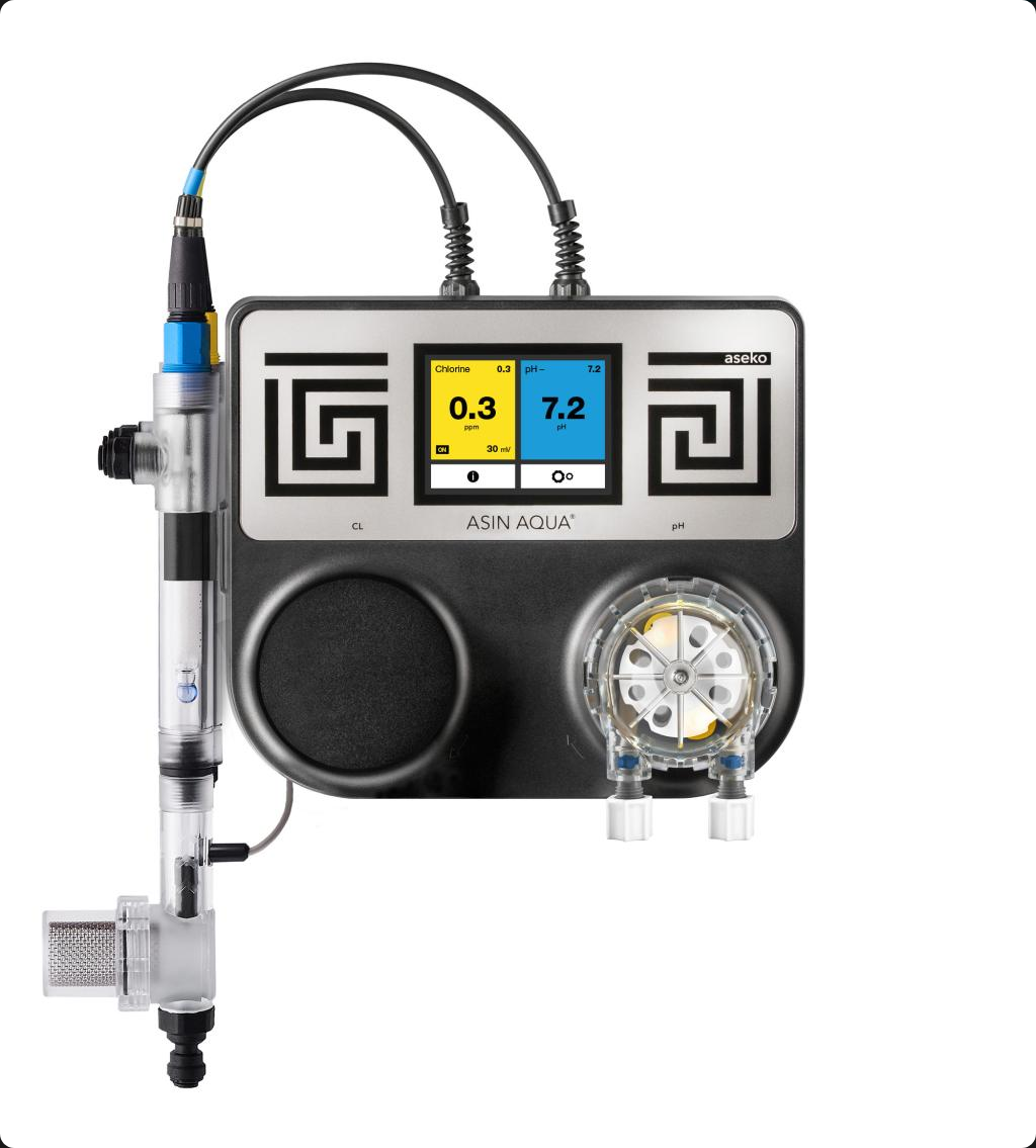 ASIN Aqua S CLF je dávkovací automat vybavený sondou CLF pro měření volného chloru a sondou pH. Vhodný pro použití ve spojení s ASIN Salt (elektrolyzérem slané vody).
