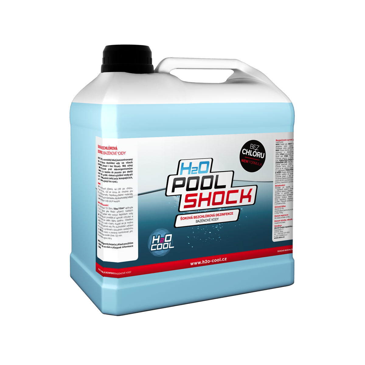 H2O POOL SHOCK je novodobý tekutý koncentrovaný přípravek na šokovou dezinfekci vody ve všech typech bazénů (s filtrací i bez filtrace). Má silný a dlouhodobý účinek proti mikroorganismům a řasám při uvedení bazénu do provozu po delší pauze. Je vhodný na rychlé – šokové vyčistění vody při extrémním zatížení bazénů (velký počet koupajících, vysoká teplota vody, výskyt řas a pod.).