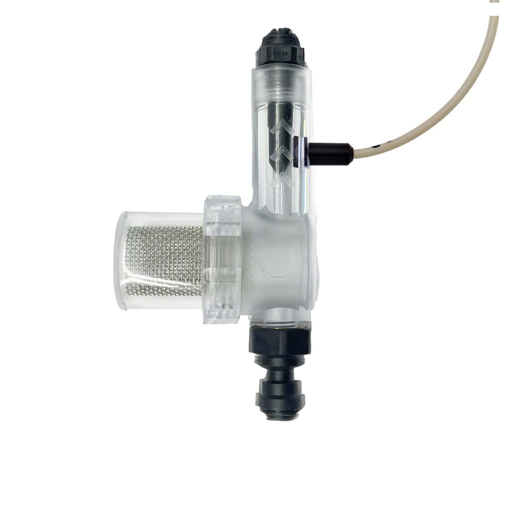 Elektronický průtokoměr s filtrem a elektronikou pro připojení s jímkou sondy pomocí potrubí. Viz zapojení průtokoměru s jímkou sondy na obrázku 2